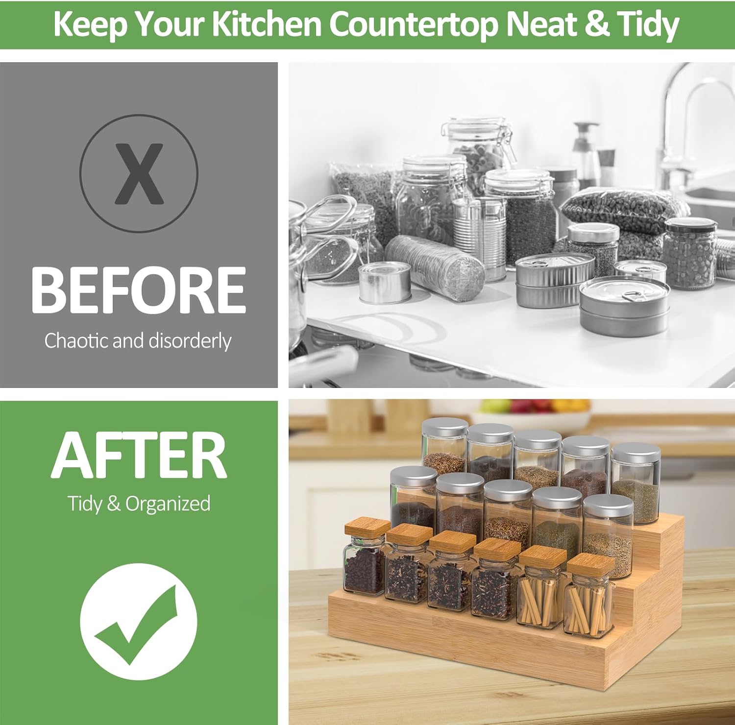 - GENEROUS STORAGE - You will get 2 pack 3-tier spice racks and they provide a home for up to 36pcs 3oz jars. Each tier measures 2.48" D x 1.38" H, keeping the jars in place and preventing them from falling. It also allows you to display your spice collections elegantly on the kitchen counter.