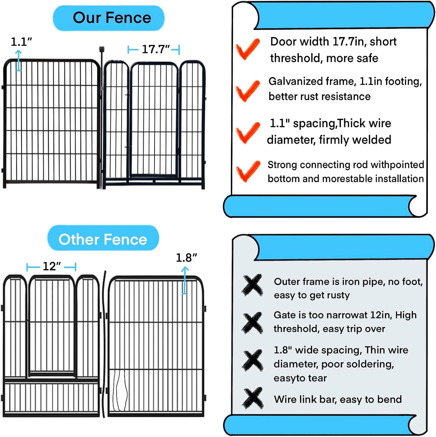 - Dual-Purpose for Indoor and Outdoor Use: This Outdoor Dog Fence Comes with Metal Rods That are 4 Inches Taller Than The Panels. When Used Outdoors, You Can Insert The Rods Into The Ground to Enhance Stability. As An Animal Barrier Fence, It Keeps Small Animals Out of The Garden and Won’t be Knocked Over by Dogs. For Indoor Use, The Fence Rods are Fitted with Rubber Protective Covers to Prevent Floor Scratches During Use.