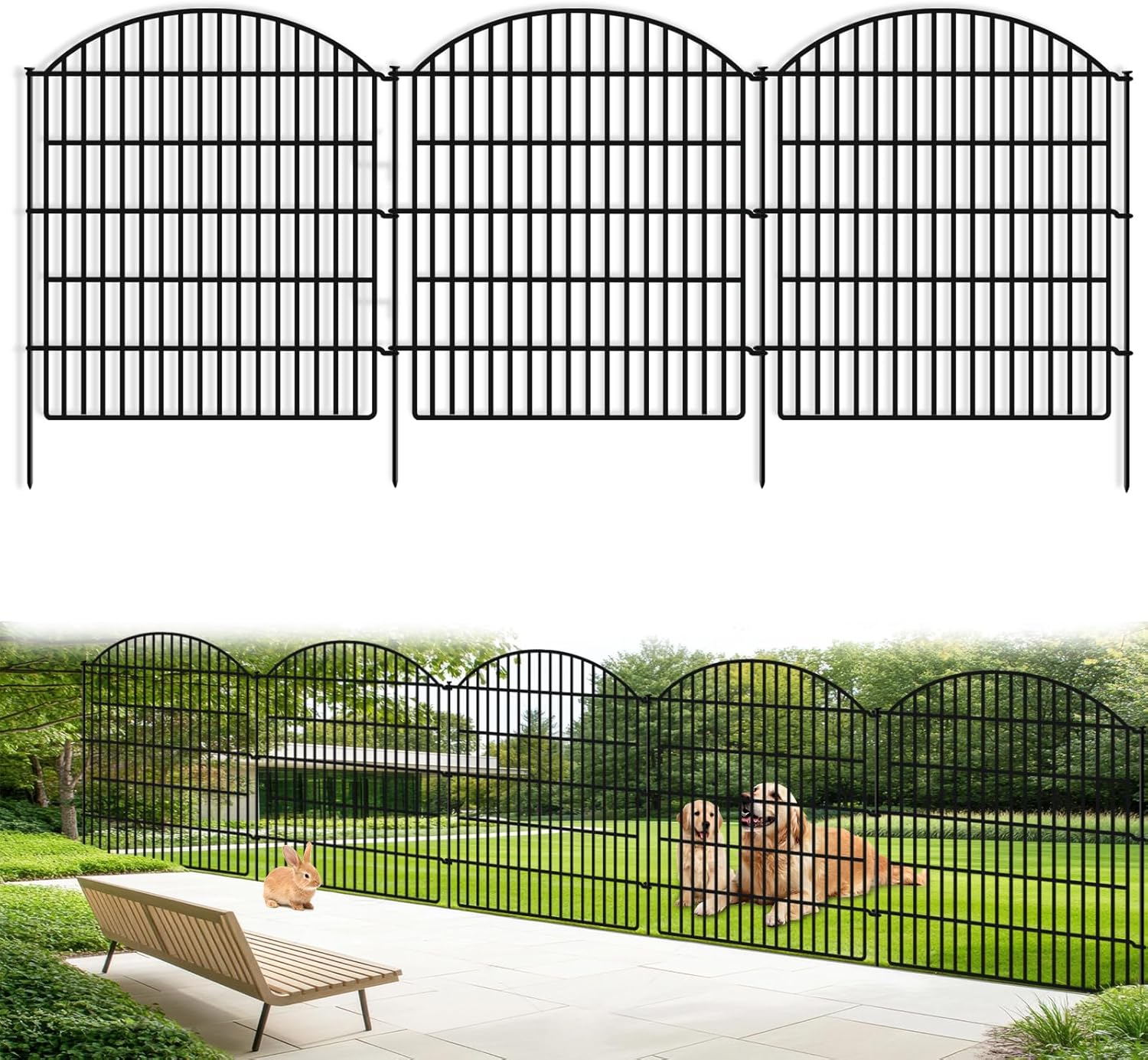 - MORE AVAILABLE SIZE: The classic arch shape design garden fence single piece measures 29" wide, 33" high, 1.4" gap. Comes with 17 metal stakes are 44" in height, which can be inserted into about 12.6 inches above the ground, making it strong enough to prevent animals from entering & leaving, dog digging, and even keep rabbits away from your plants. A total of 16 fence panels, connecting 17 fence stakes, the total length of the garden fence is approximately 38.67 ft.