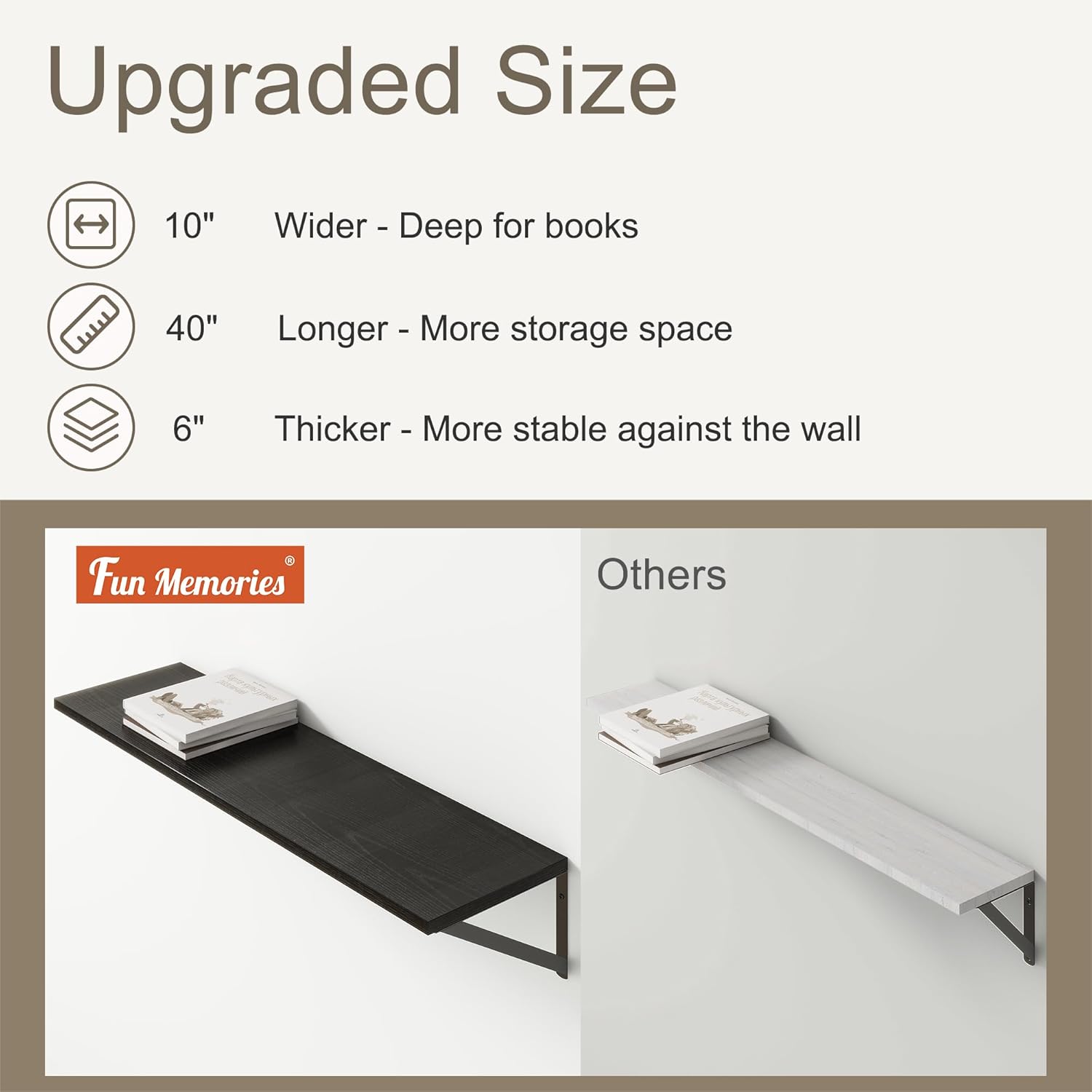 - 【10 INCH DEEP FLOATING SHELF】This extra deeper and wider wall shelves are 10 inches in depth and 39.4 inches in length instead of the regular narrow floating shelves, you can put photos, pictures, DVD players, videos, books, toys, and some other knickknack on this beautiful display wooden shelf.