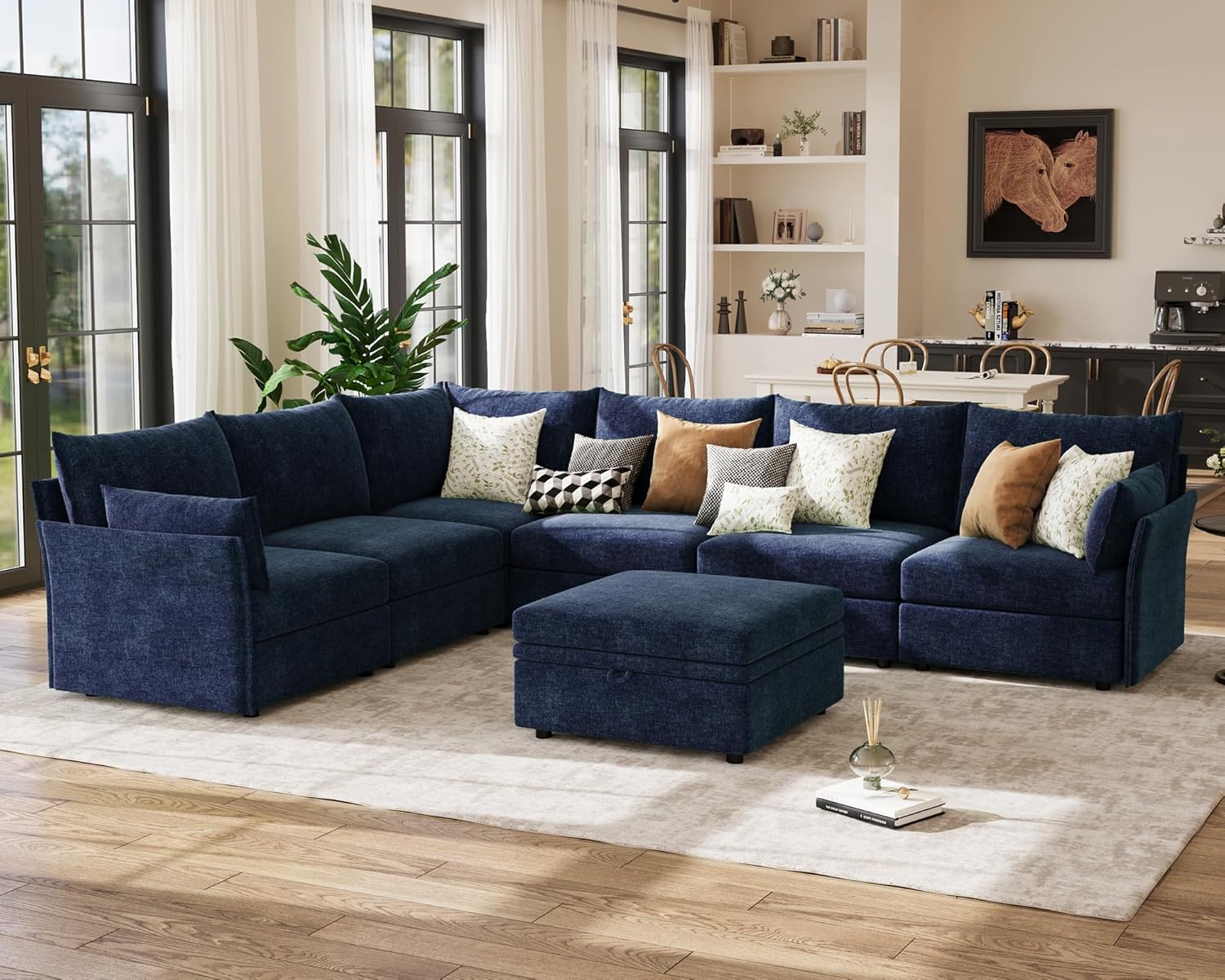136.4" Oversized Modular Sectional Sofa, L Shaped Convertible Couch with Movable Ottoman, Large 7 Seat Corner Couches for Living Room Deep Seat Blue Chenille