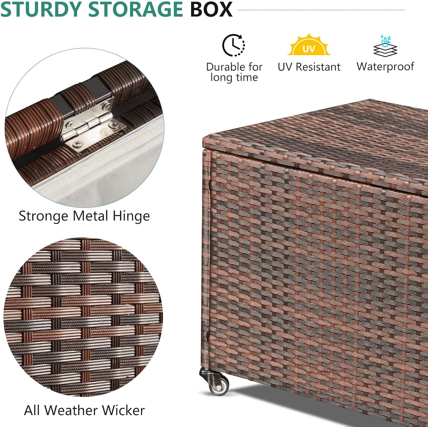 - High-quality Wicker: Crafted from high-quality wicker, this patio deck box is both stylish and durable. It has excellent weather resistance, making it a reliable choice for outdoor use. The cover of this storage bin is weatherproof and UV resistant