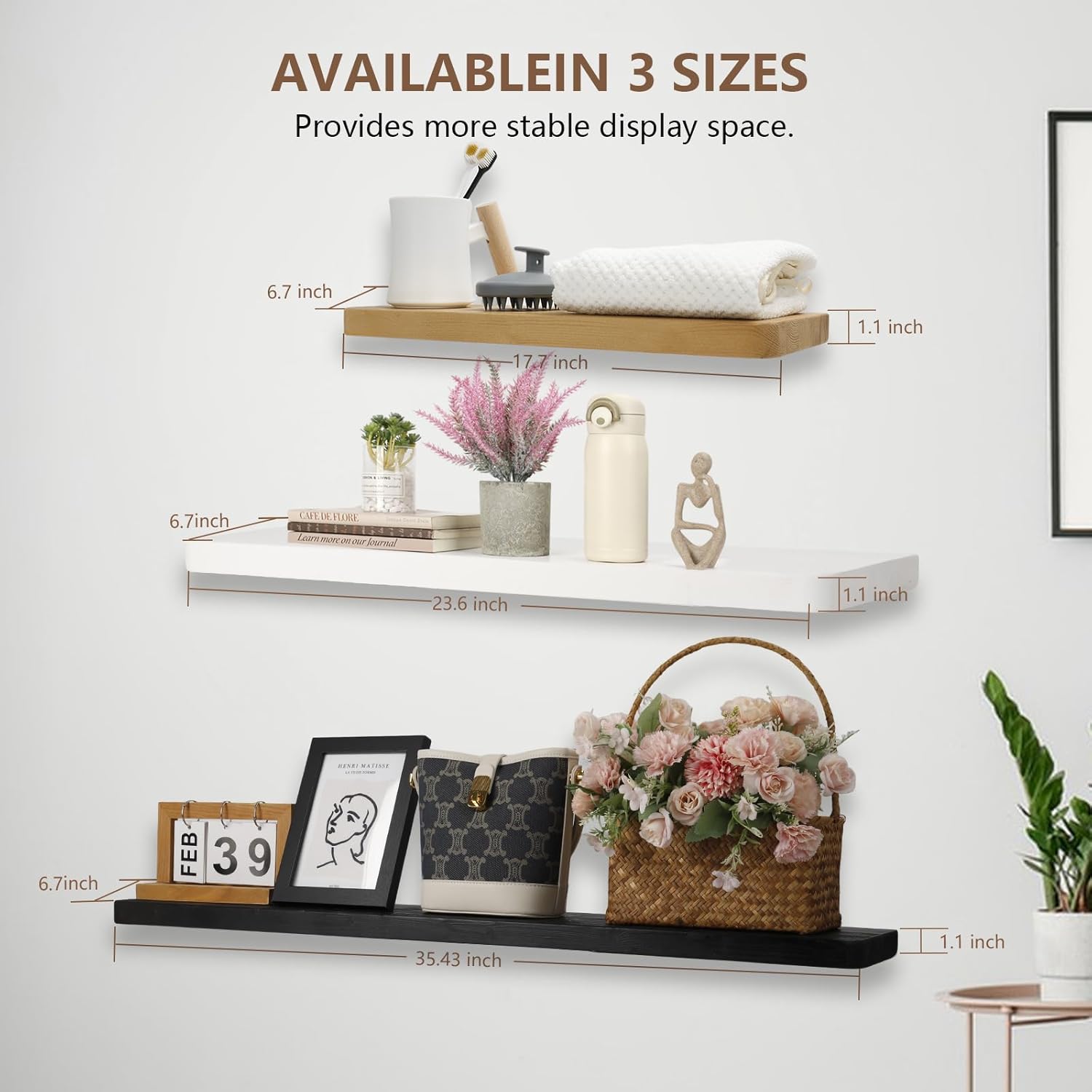 Solid Wood Floating Shelves Set of 2 - Natural, Warp & Crack Resistant 35.43 Inch Wall Shelf with Invisible Brackets Thicker, More Durable for Bathroom, Bedroom, Kitchen, Living Room (White, 35.43)