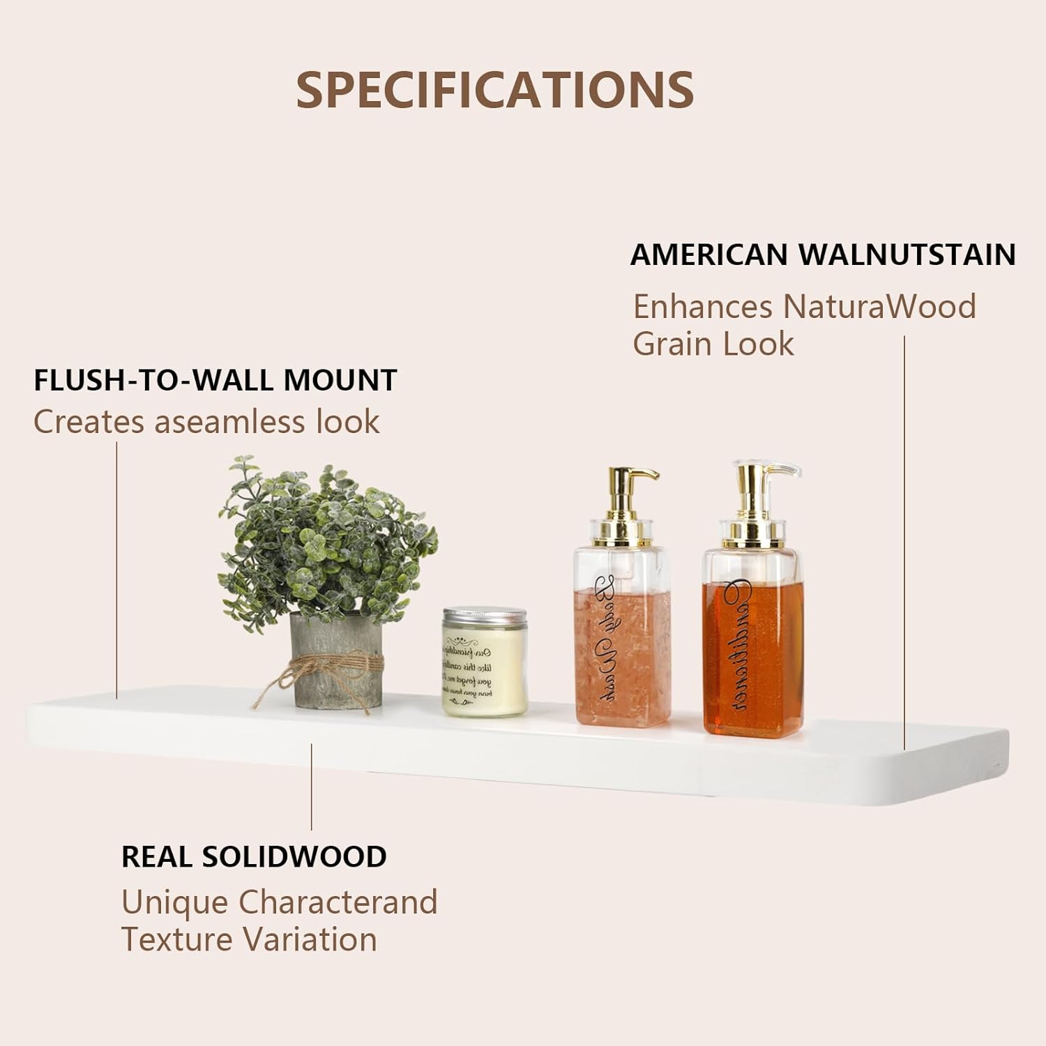 Solid Wood Floating Shelves Set of 2 - Natural, Warp & Crack Resistant 17.72 Inch Wall Shelf with Invisible Brackets Thicker, More Durable for Bathroom, Bedroom, Kitchen, Living Room (White, 17.72)