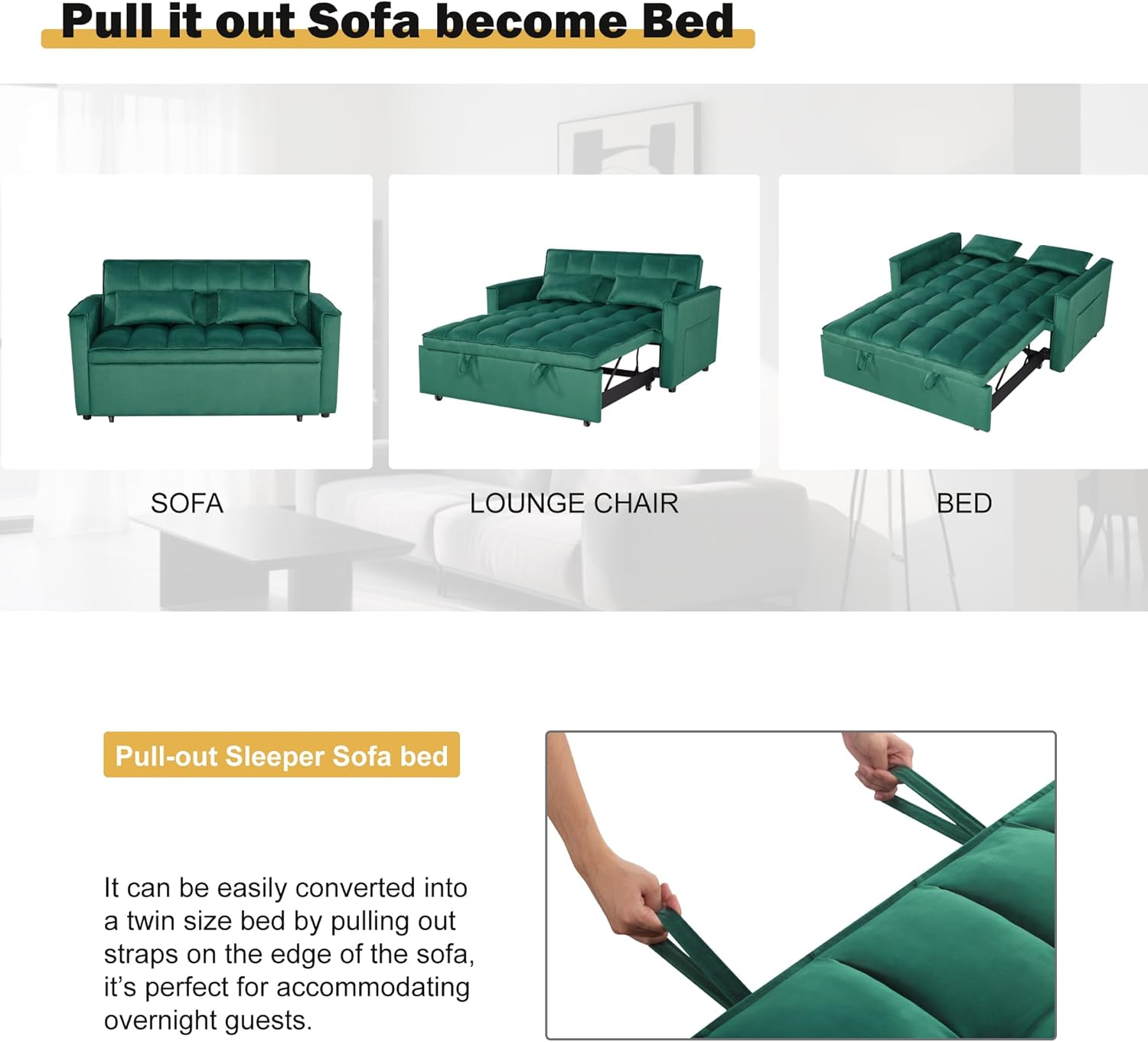 - Versatile Design: This 54” pull-out sleeper sofa easily transforms into a twin-size bed, making it an ideal choice for accommodating overnight guests. Its convertible sleeper sofa design ensures that you can quickly convert it from a stylish couch to a comfortable bed in just seconds