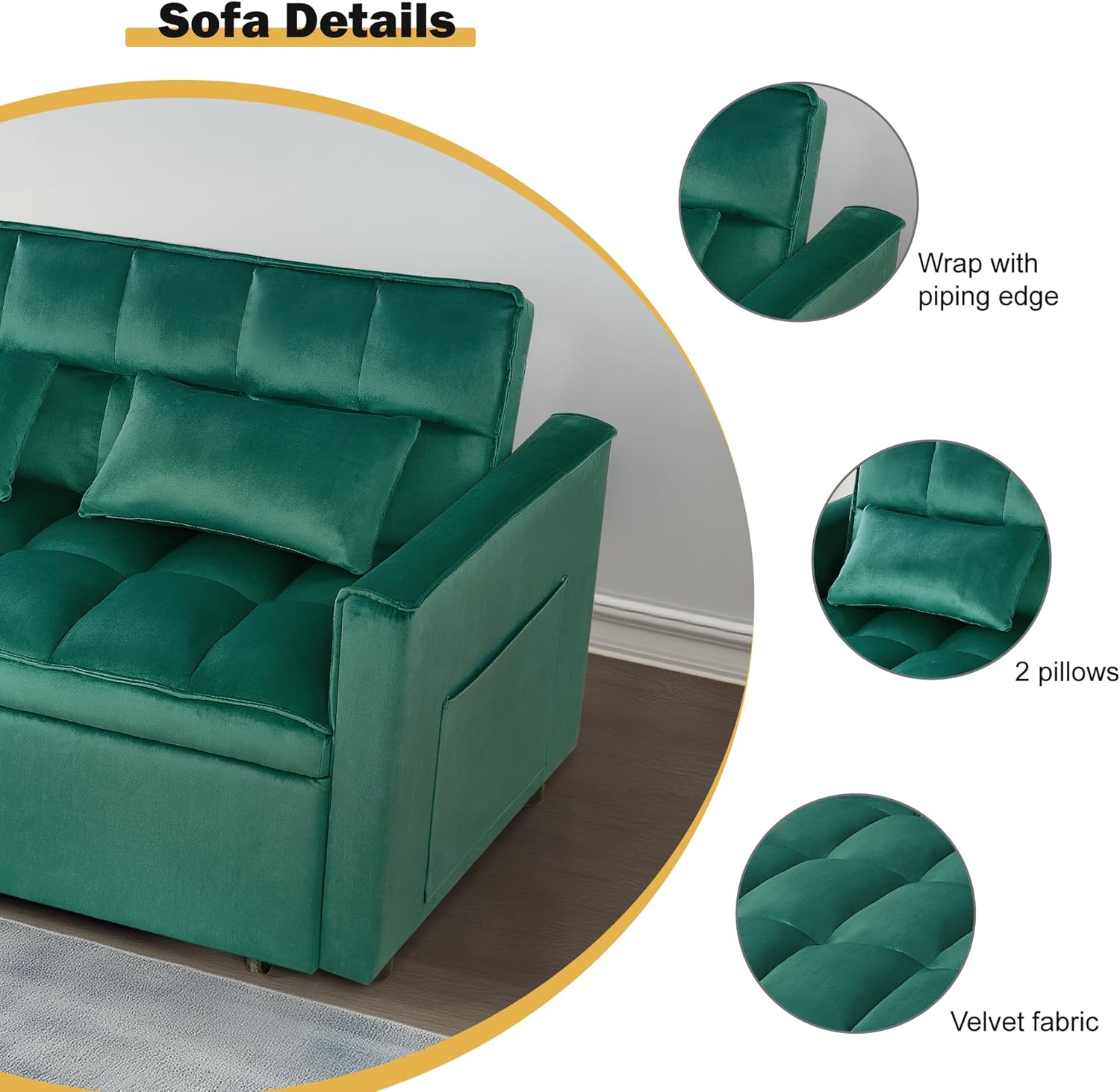 - Luxurious Comfort: Upholstered in soft velvet fabric, this sleeper sofa couch with pullout bed offers a plush seating experience. The arms, seat cushions, and back cushions are elegantly wrapped with piping edges, ensuring both style and comfort for your living room or guest room