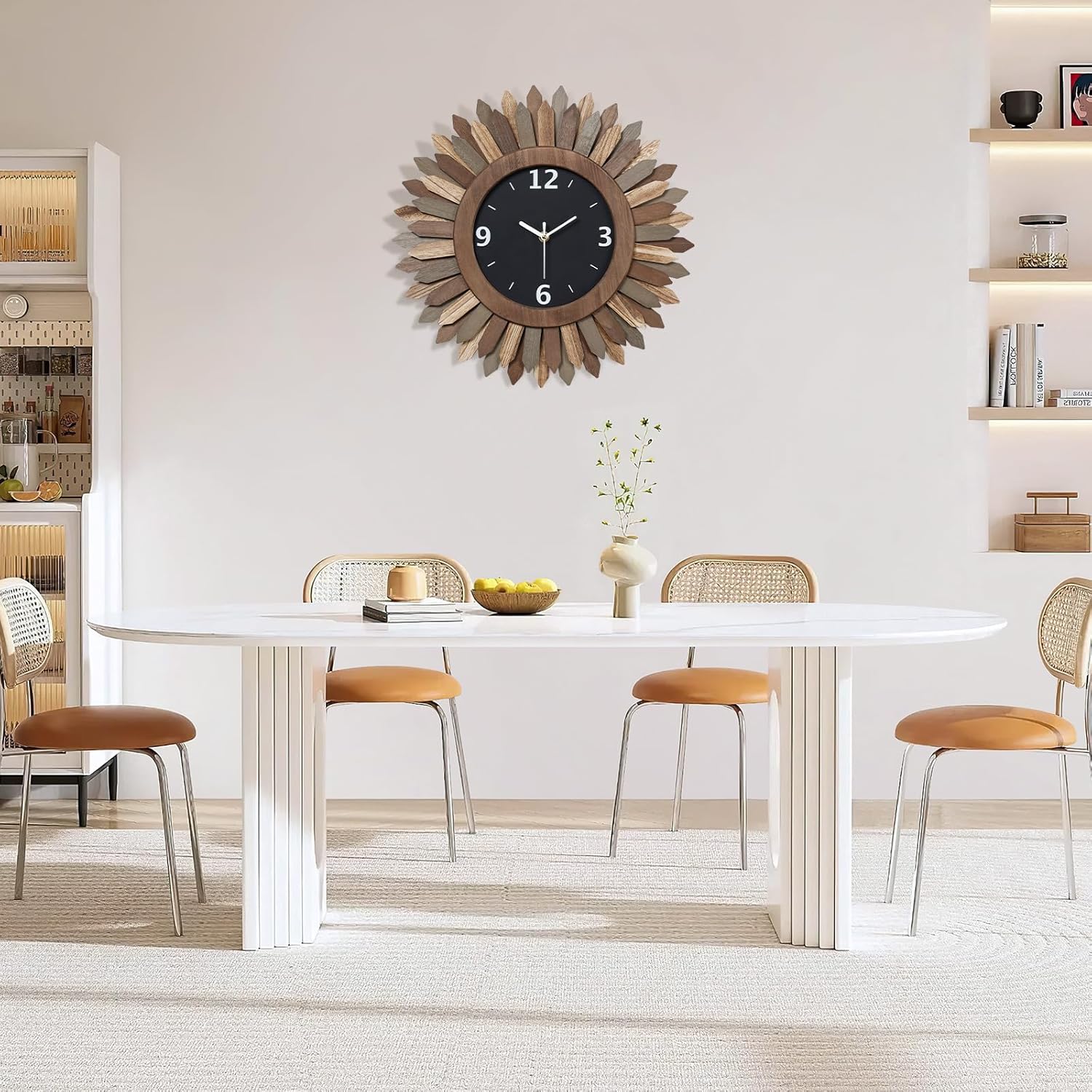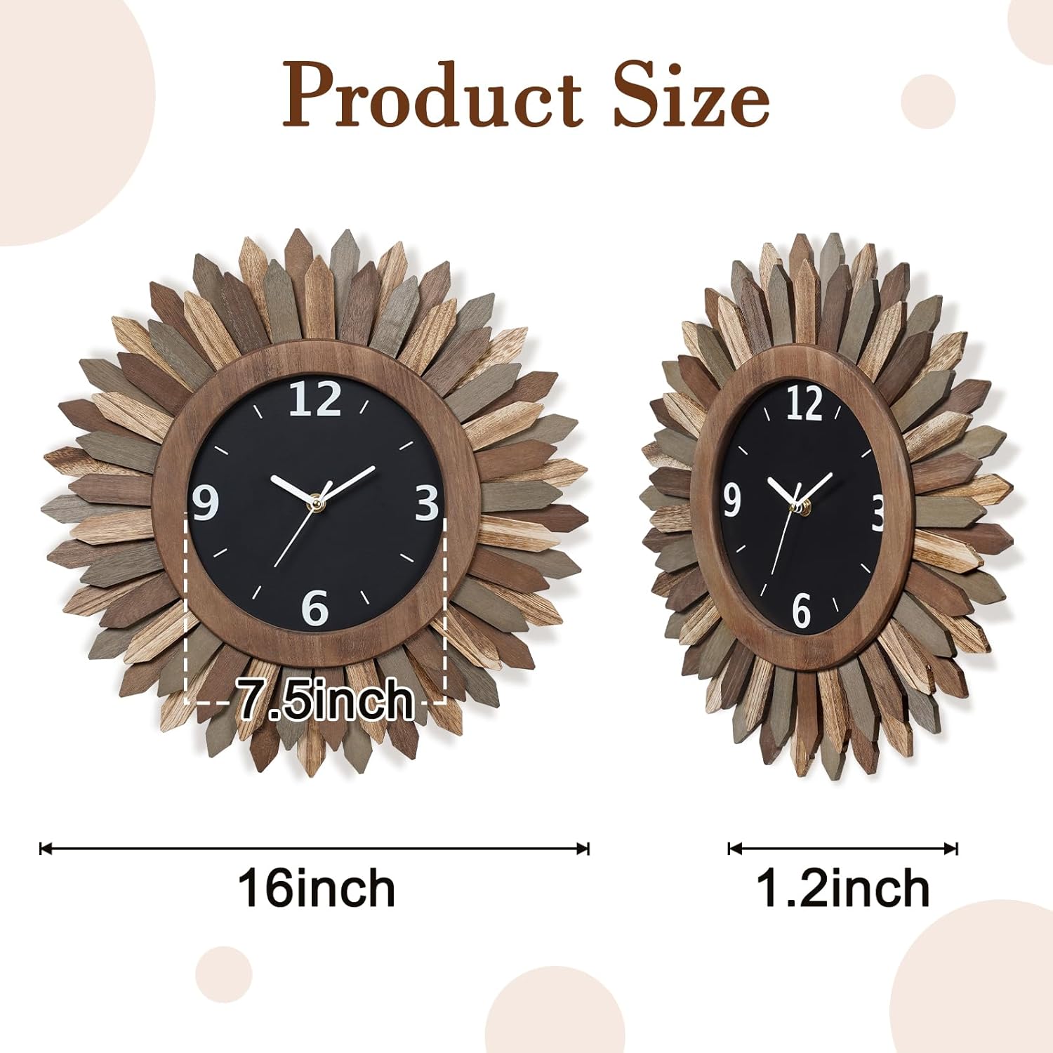 - Boho Wall Decor Clock: Inspired by the sunburst of Bohemian style, this modern wall clock face design is unique and eye-catching, 2 tier wood sunburst looks like the "sun". With a black wooden case, white hour, minute and seconds hands and large white arabic numerals, this decorative wall clock is easy to read from a distance