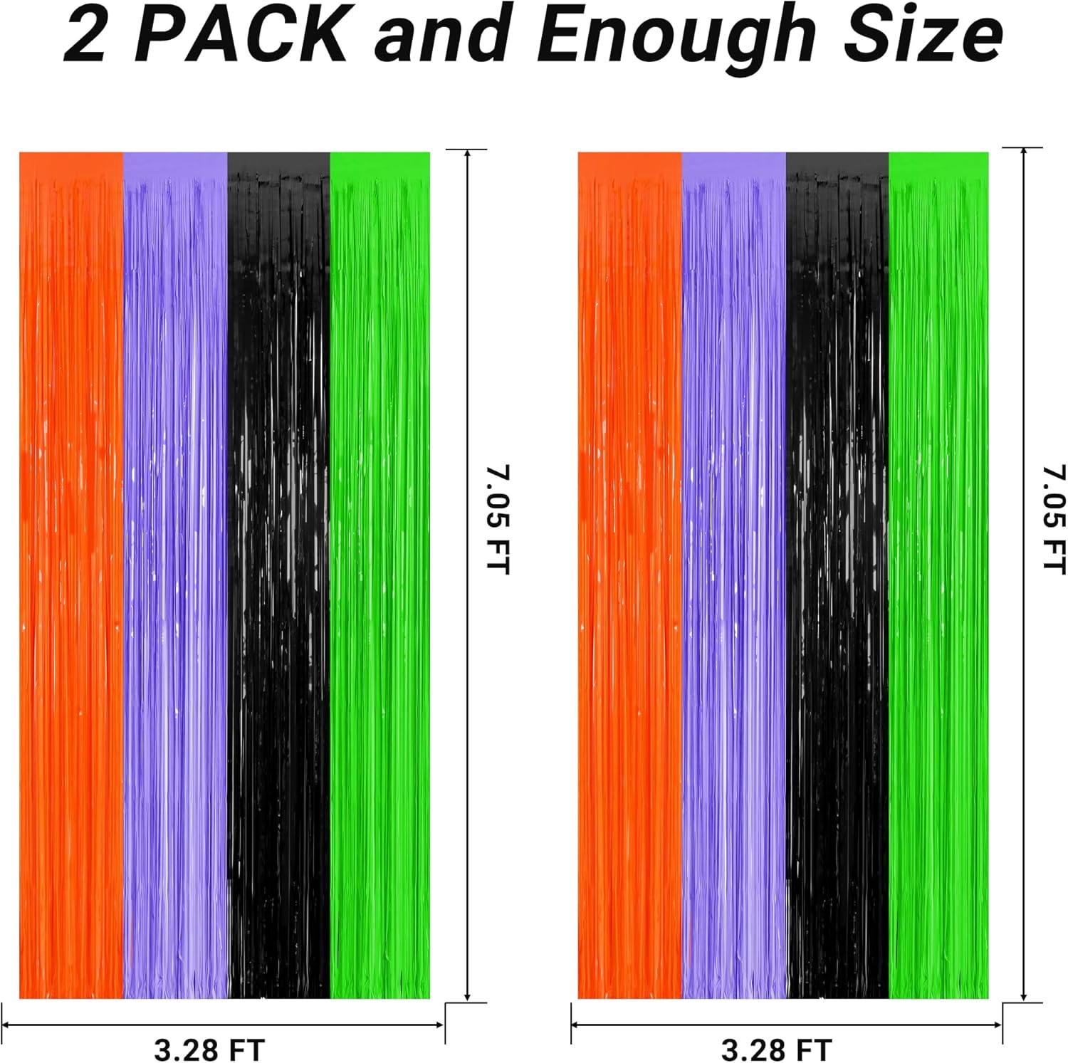 2 Pack Halloween Backdrop, 3.28 FT x 7.05 FT Orange Purple Black Green Party Streamer, Metallic Foil Curtains Tinsel Backdrop, Halloween Party Decorations Photo Props for Door Wall
