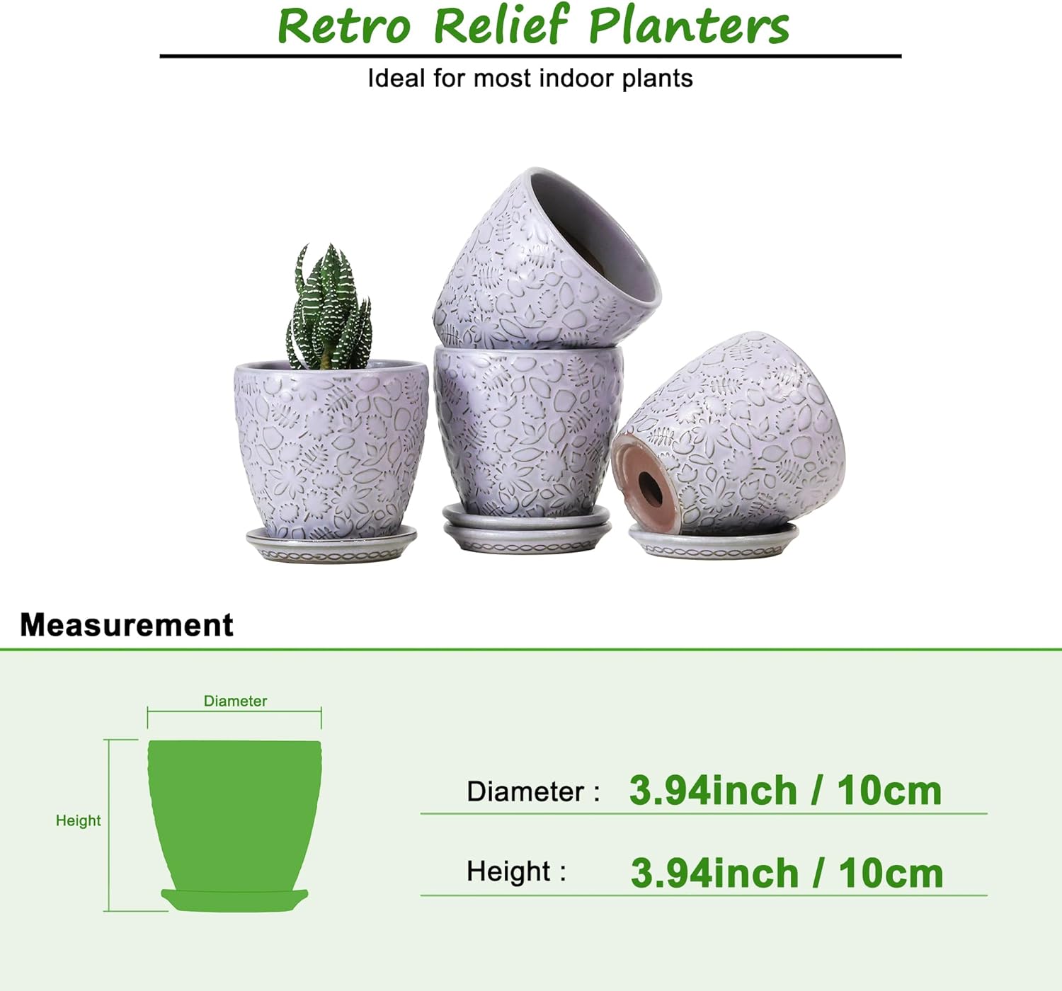 4 Inch Retro Ceramic Planter Set of 4 with Drainage Hole and Saucer for Plants, Indoor-Outdoor Small Garden Pots for Succulent, Herb and Flower (Fits Inner Pots Up to 3 Inch, Retro Purple)