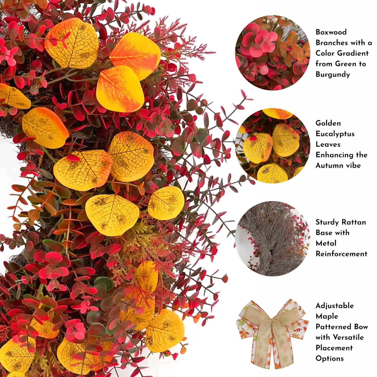 - Artisan-crafted: each leaf is individually inserted into the best place of a ratten base. All leaves using recycled plastic materials, our zero-waste process ensures every wreath is unique while reducing environmental impact — proof that eco-conscious decor can be stunningly beautiful.