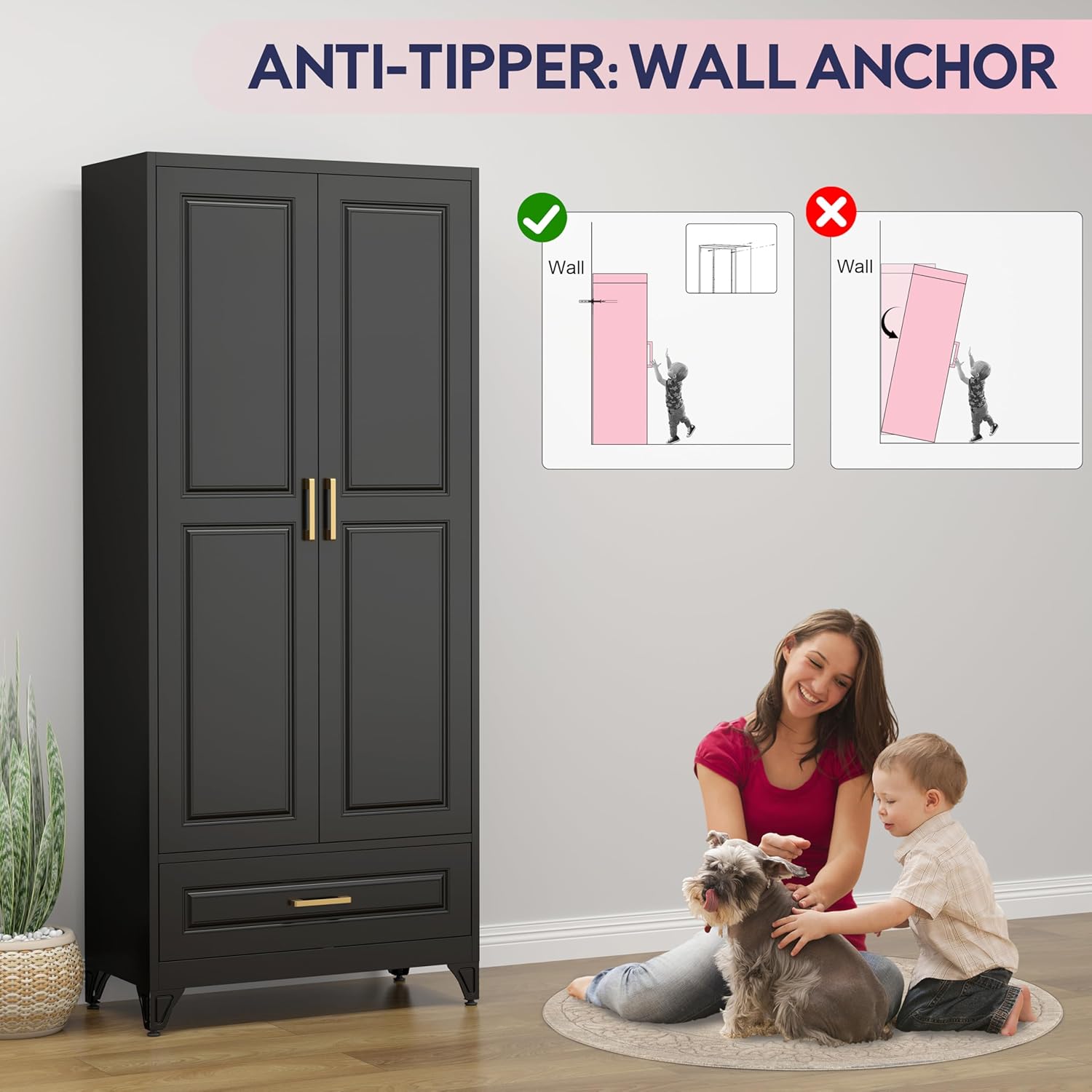 - Secure Anti-Tip Design: Built-in wall mounting holes secure the tall cabinet to prevent tipping and ensure safety around children or pets. Adjustable legs compensate for uneven floors and prevent wobbling. Reliable pantry storage cabinet for kitchens, garages, or home offices