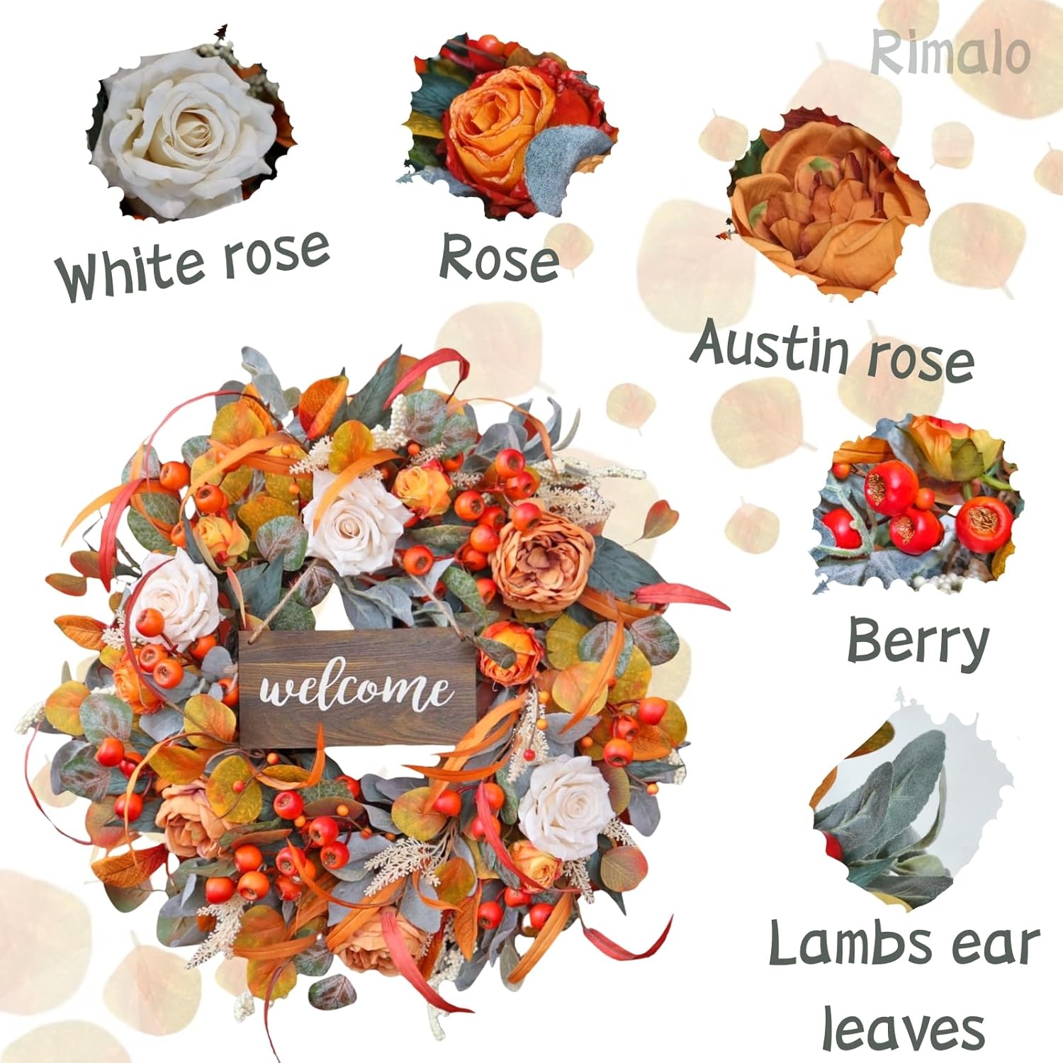 - 🍁【Lifelike Fall Wreath with Roses & Lamb’s Ear Leaves】This Fall Wreath for Front Door is filled with seasonal charm, featuring a thoughtful combination of lamb’s ear leaves, white roses, Austen roses, dried roses, poppy berries, eucalyptus leaves, grain ears, berries, and willow leaves. With soft, rich tones and realistic textures, this 24 inch fall wreath brings a refined and romantic harvest vibe to any space.