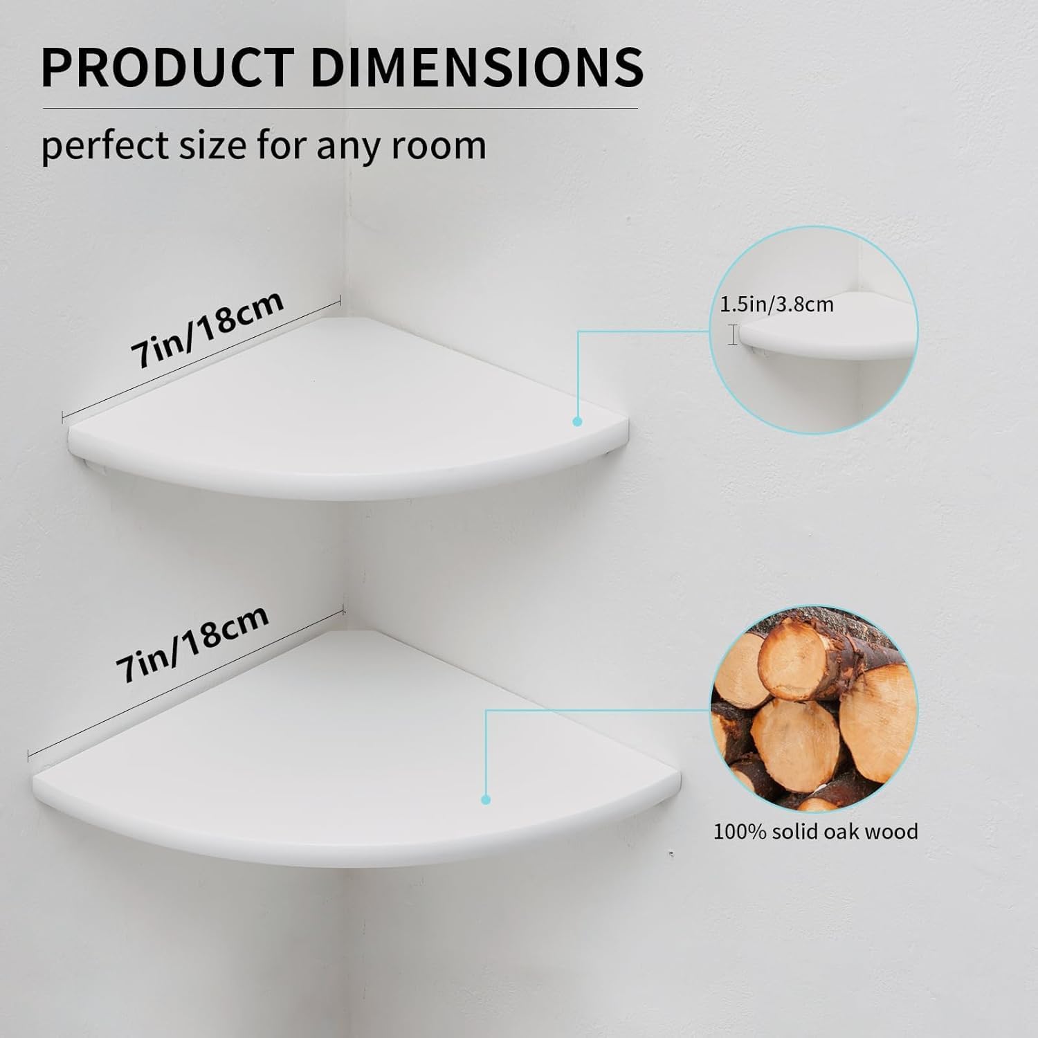 Corner Shelves, Floating Corner Shelf, Set of 2 Solid Oak Wood Wall Shelves, Round End Wall Mount with Wire Hole Shelving for Small Plant for Bedroom Kitchen, Living Room (White, 7.1in 2P)