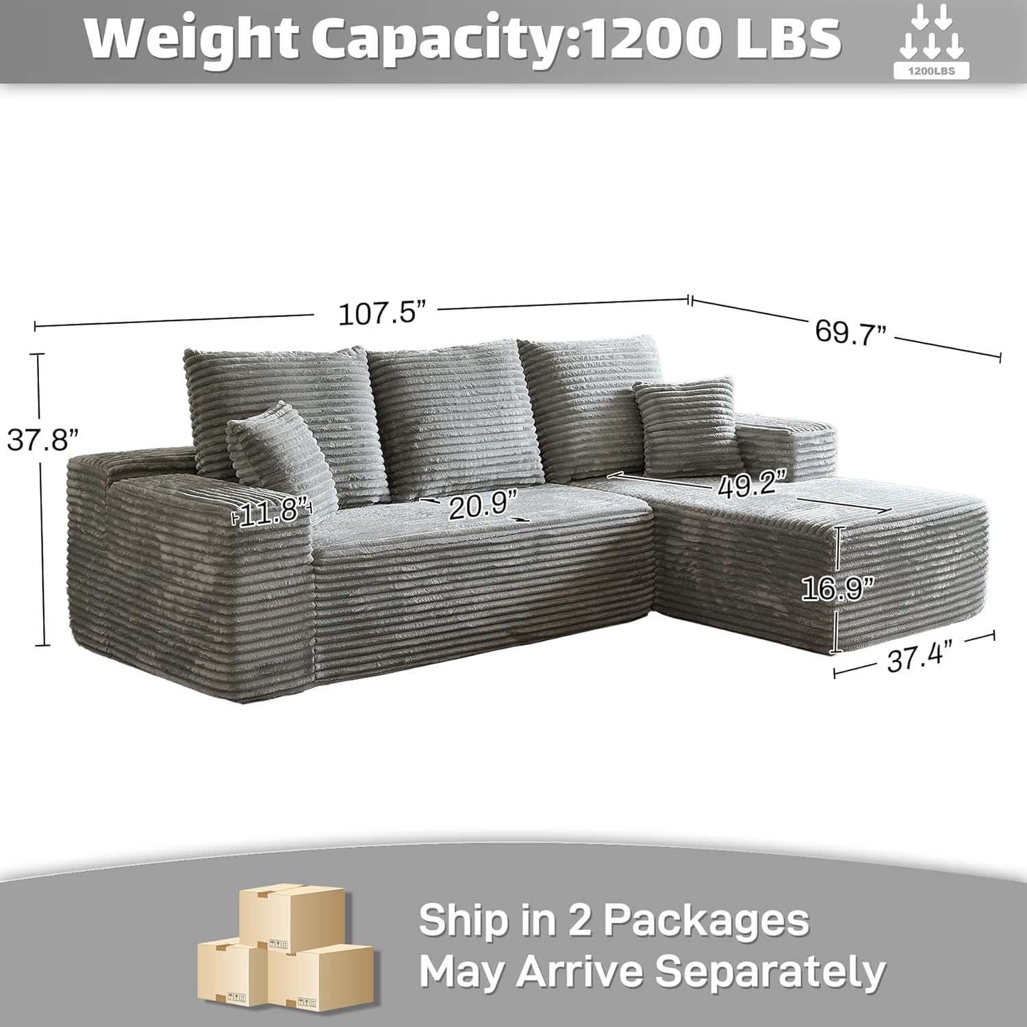 - 【No Assembly Required Sectionals】Overall Dimension:107.5"W x 69.7"D x 37.8"H. Escape the typical furniture setup hassle with our modular cloud lounge. Simply unbox all parts and lightly tap each segment to boost its springiness and poof, bringing it back to its photogenic glory. Complete revival may take up to around 72 hours. Delight in the ease of a no-assembly nirvana