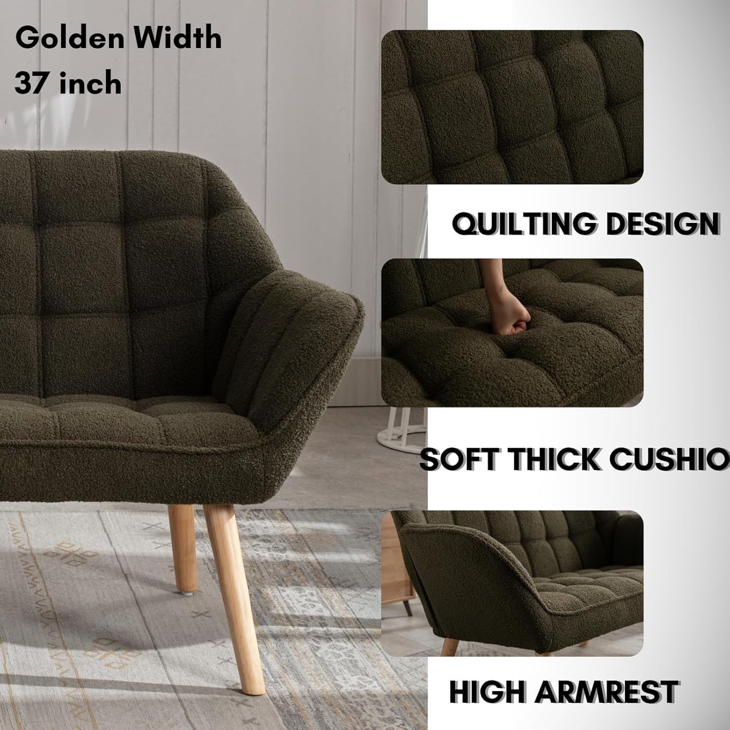 48”Small Loveseat Sofa, Modern Sherpa Upholstered Mini Couch 2-Seater Fluffy Love Seat with Quilting Backs and Wood Legs for Small Space, Living Room, Bedroom, Green