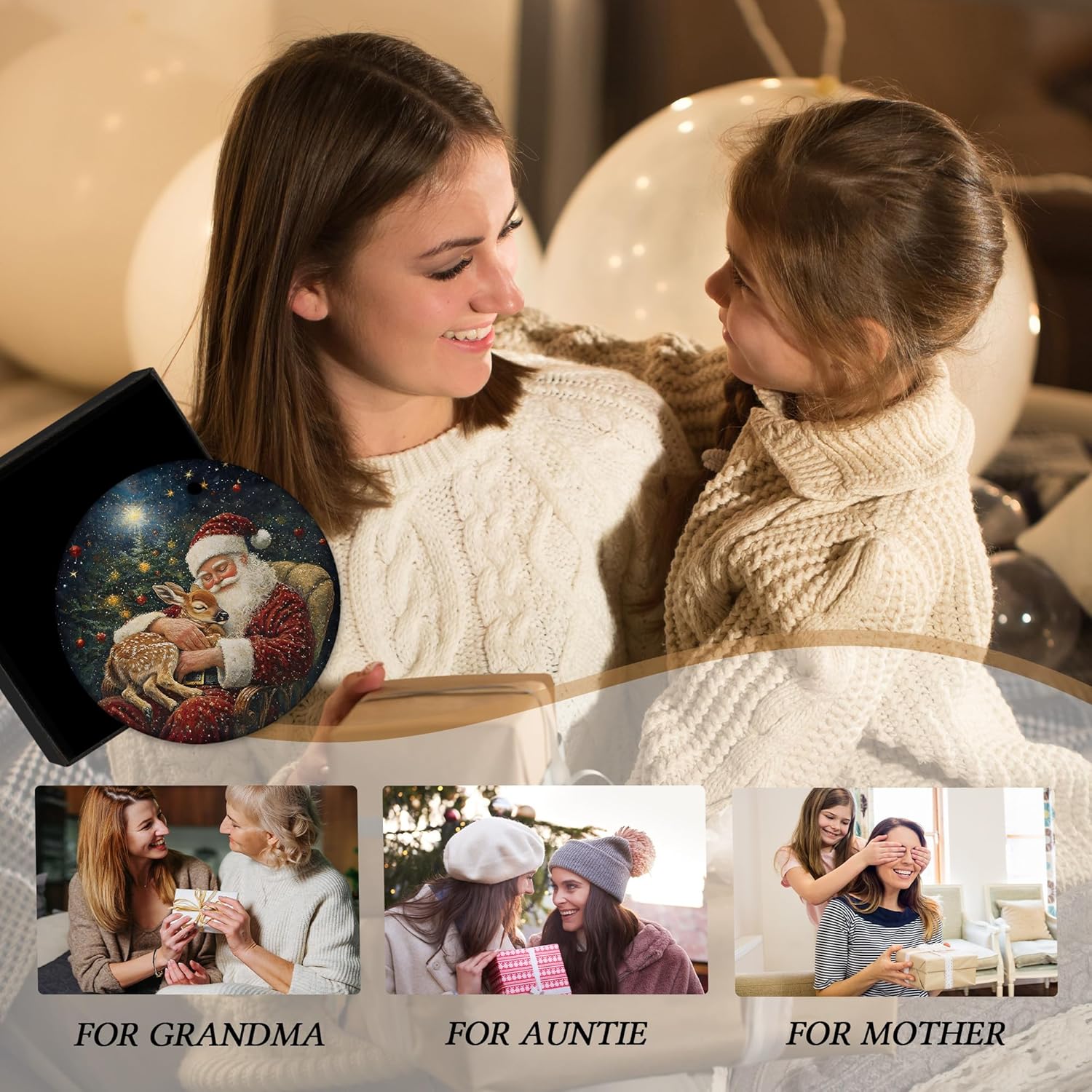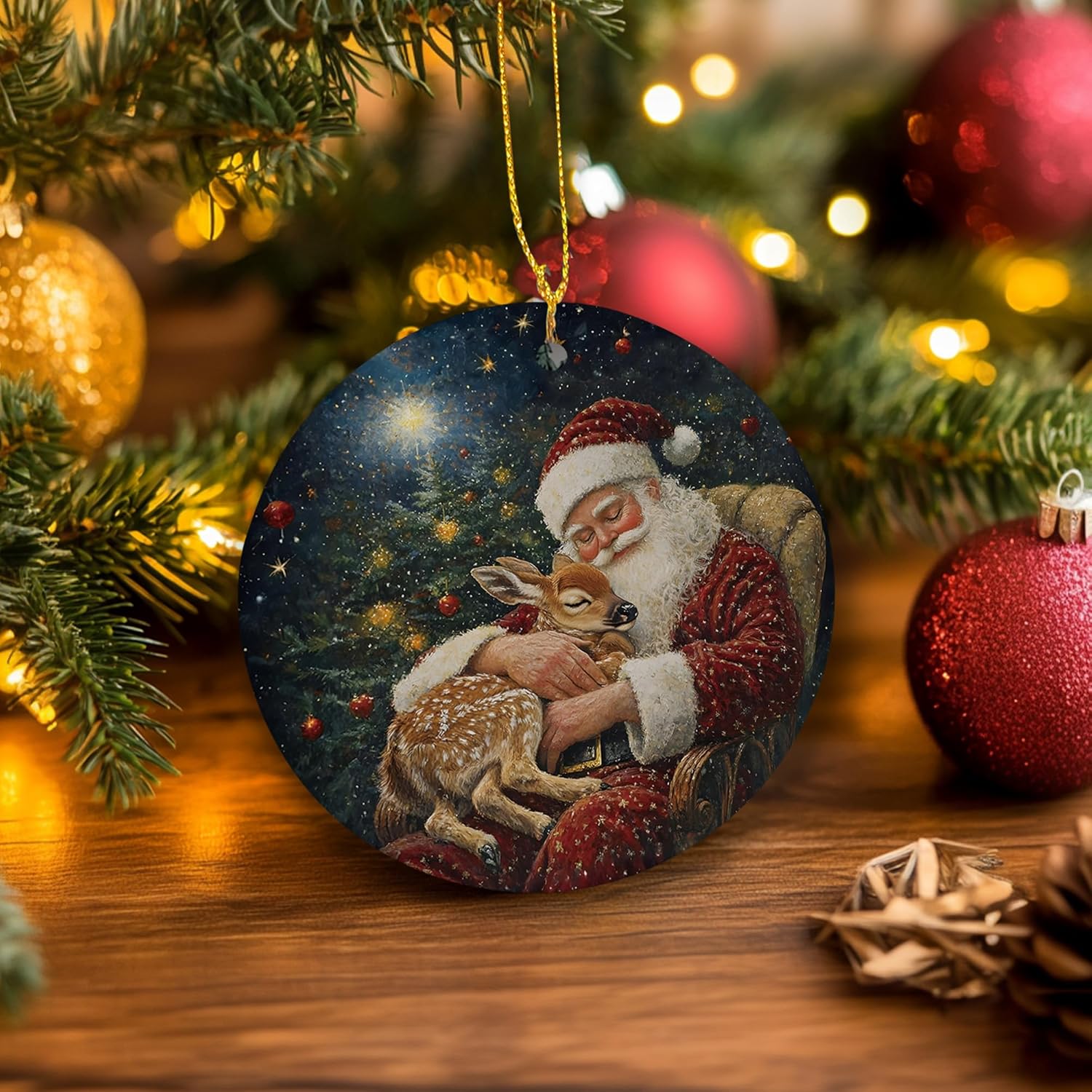 Vintage Christmas Santa Deer Ceramic Ornament Gifts, Rustic Winter Christmas Decorative Hanging Ornaments for Xmas Tree Holiday Party Decoration, Santa Deer Xmas Tree Decorations