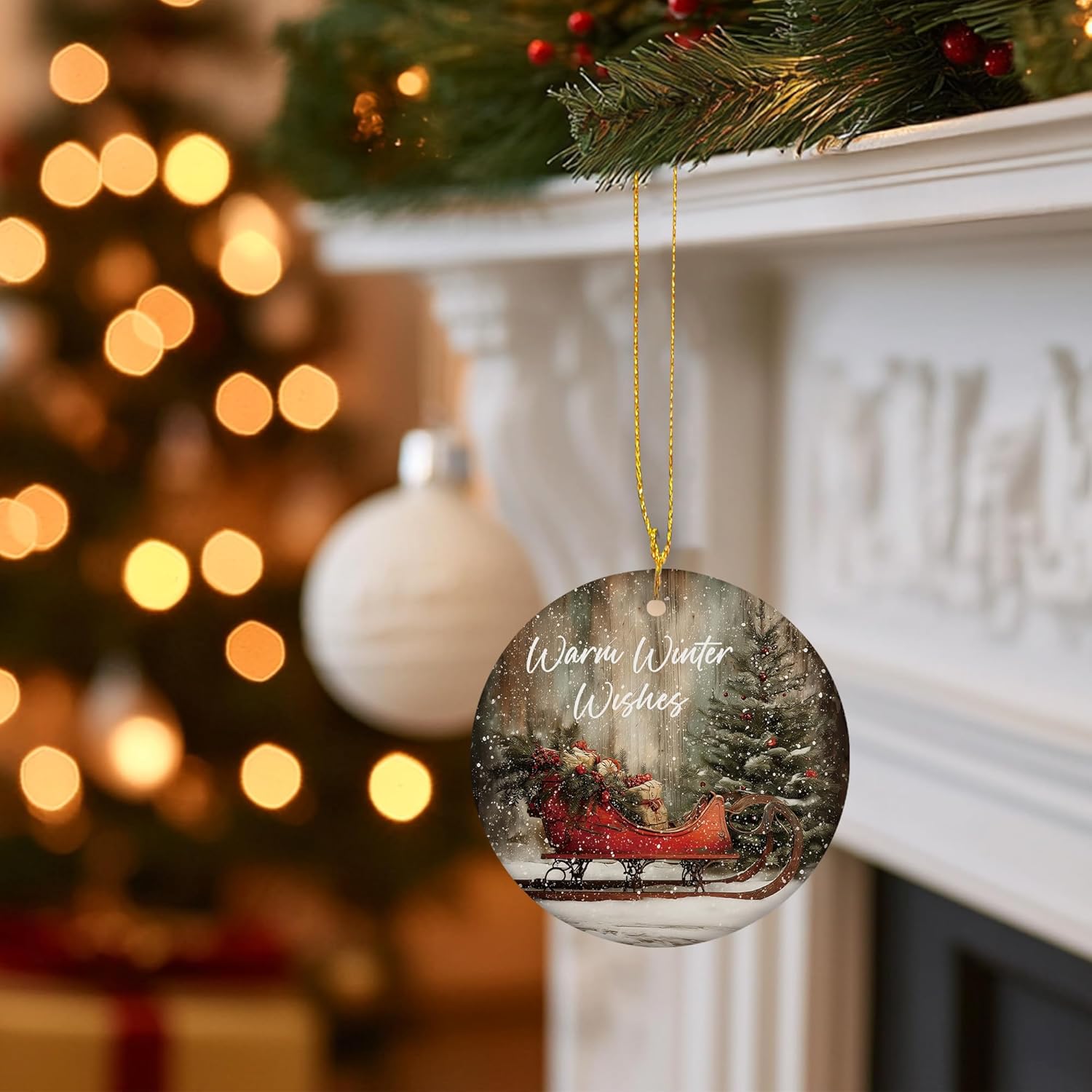 Vintage Rustic Christmas Ceramic Ornament Gifts, Farmhouse Winter Snowy Christmas Sleigh Decorative Hanging Ornaments for Xmas Tree Holiday Party Decoration, Winter Xmas Tree Decorations
