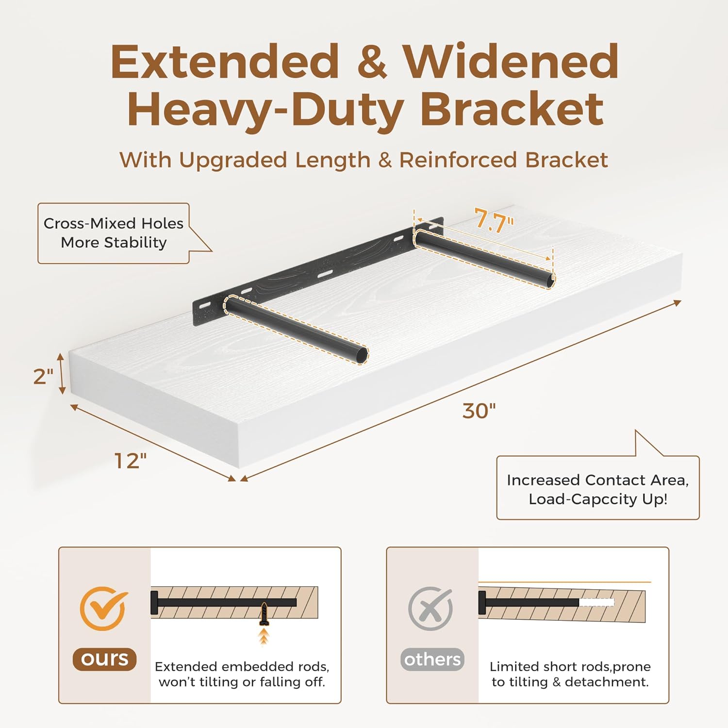 Fun Memories White Floating Shelves 30x 12 Inch, Deep Floating Shelf Wall Mounted, 12" Deep Wall Shelves for Books, Bathroom, Bedroom, Kitchen, Thicked Shelves for Home Storage & Display, Set of 2