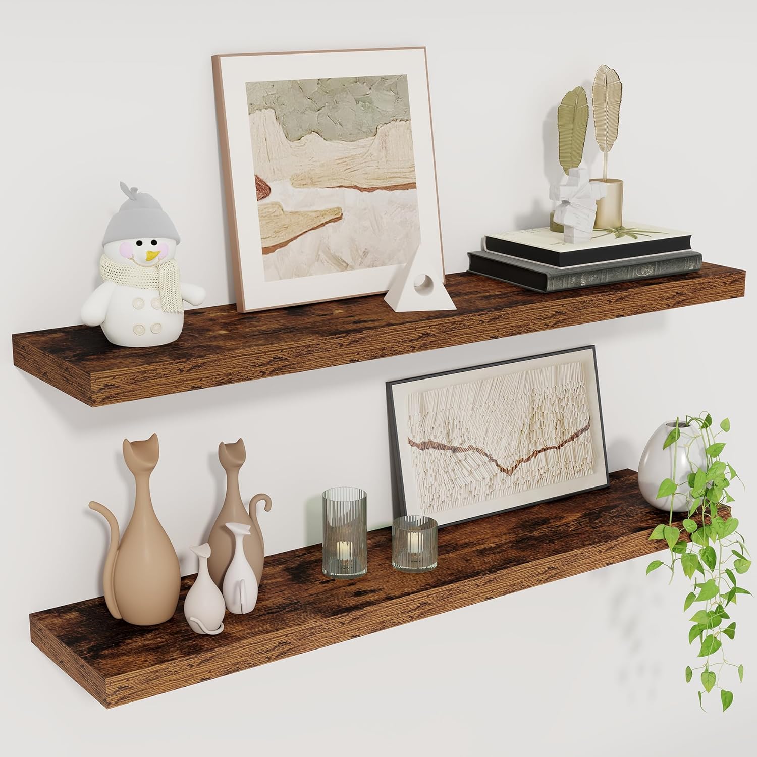 - STYLE & VERSATILITY: Elevate your home with our set of 2 elegant wall shelves, designed for versatile display options. Arrange them side by side for a clean, unified look, or stagger them for a bold, dynamic effect. Adding a touch of sophistication while providing practical storage