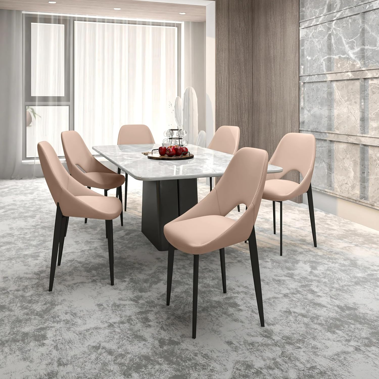 - Immerse yourself in the captivating fusion of design with our Amalfi modern dining chairs. Meticulously crafted, these side chairs seamlessly blend contemporary flair with timeless comfort, offering the perfect harmony of modern style and classic coziness. Elevate your dining space into a captivating haven and indulge in the sleek, stylish allure of our carefully curated design, featuring a curved back design and fabric seat for added comfort and elegance.