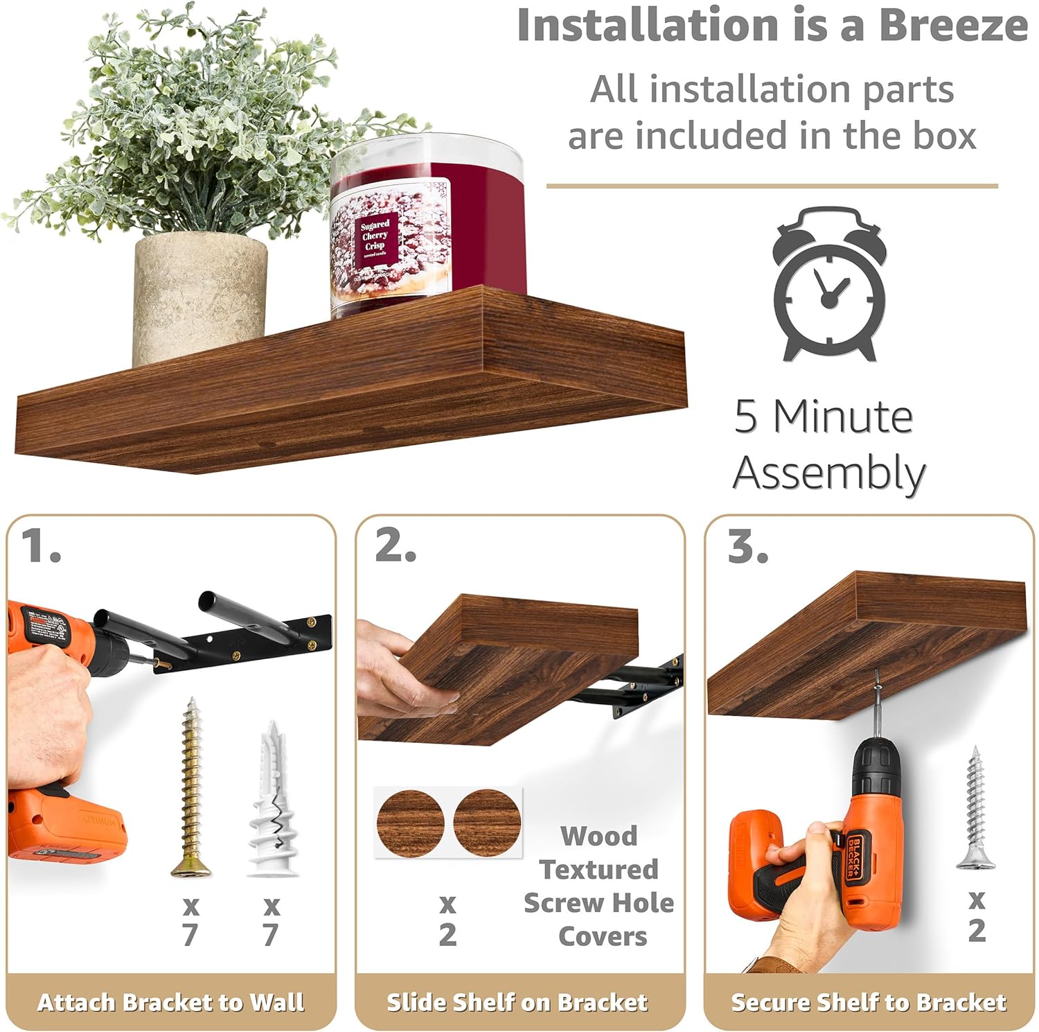 - Easy Installation: Mounting hardware INCLUDED the Hanging shelves are made of beautiful MDF with PVC + Bracket - Sturdy enough to arrange and display your favorite small objects - Attaches firmly to the wall without visible support - Minor assembly required - Supports up to 22 pounds per shelf - Measures approximately 16.25 inch L x 5.50 inch W - Each display shelf 1.5 inch thick