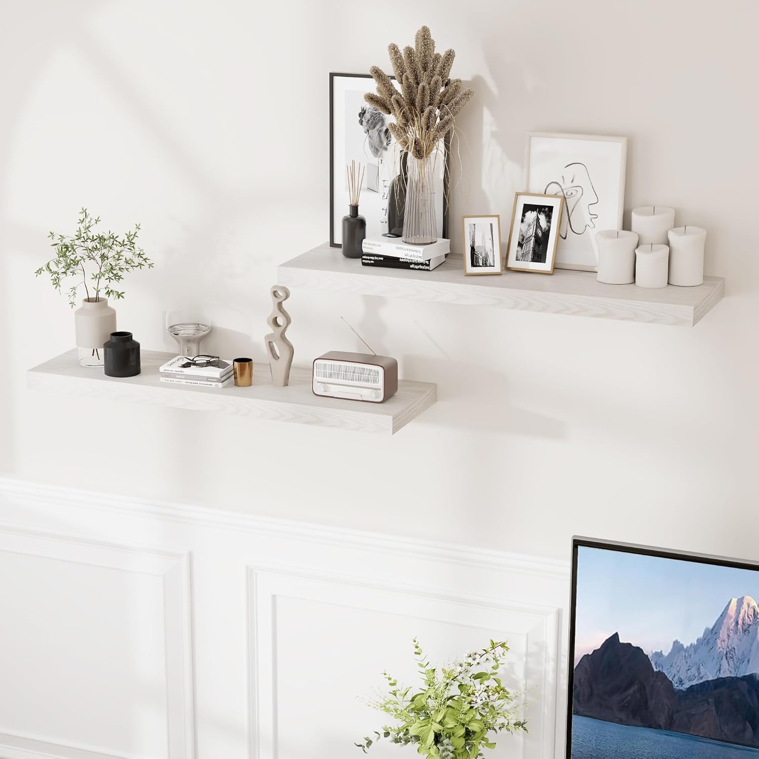 - 【DECORATIVE & FUNCTIONAL】The wall-mounted floating shelves are designed for decoration and storage, utilizing and decorating any space in your home. Used as shelf decor to show your collection, books, or prize, the hanging shelves are perfect for displaying your photo frame, small plants, model, or audio in your living room, office, study. And can also use as over the toilet storage shelf in the bathroom to hold toiletries or used as kitchen shelf to storage condiments.