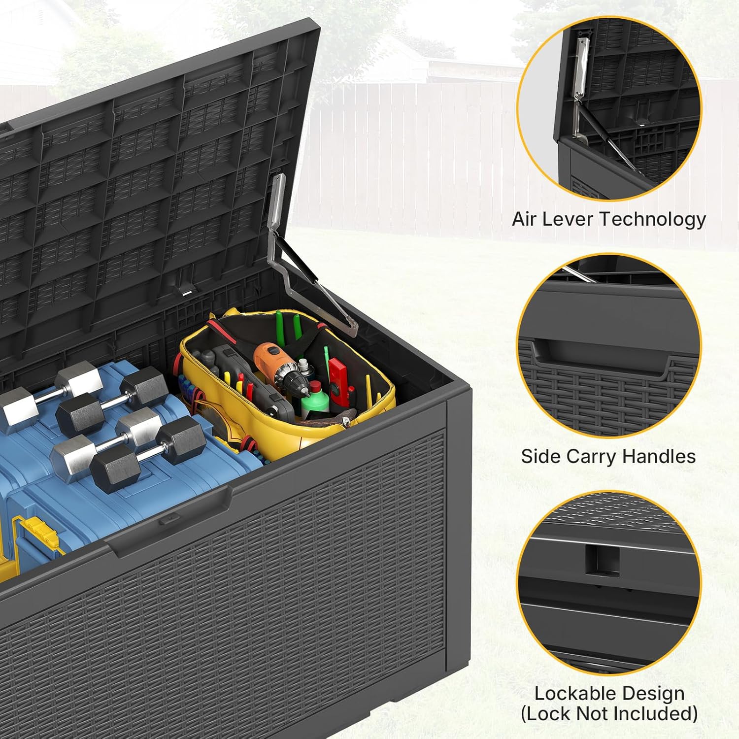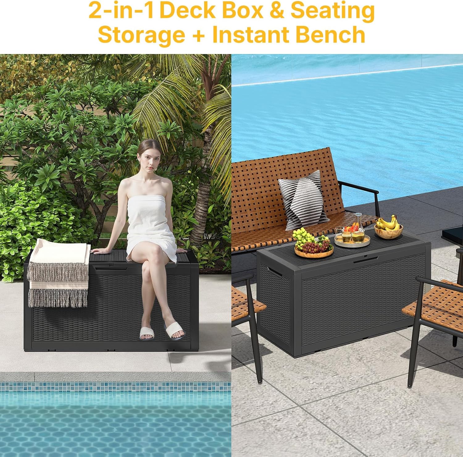 - 【All-Weather Design】Elevate your outdoor space with this premium rattan-pattern resin deck box. The construction maintains its rich woven appearance season after season, resisting fading from intense sun exposure. Perfect for complementing patio furniture sets by the pool, garden or porch.