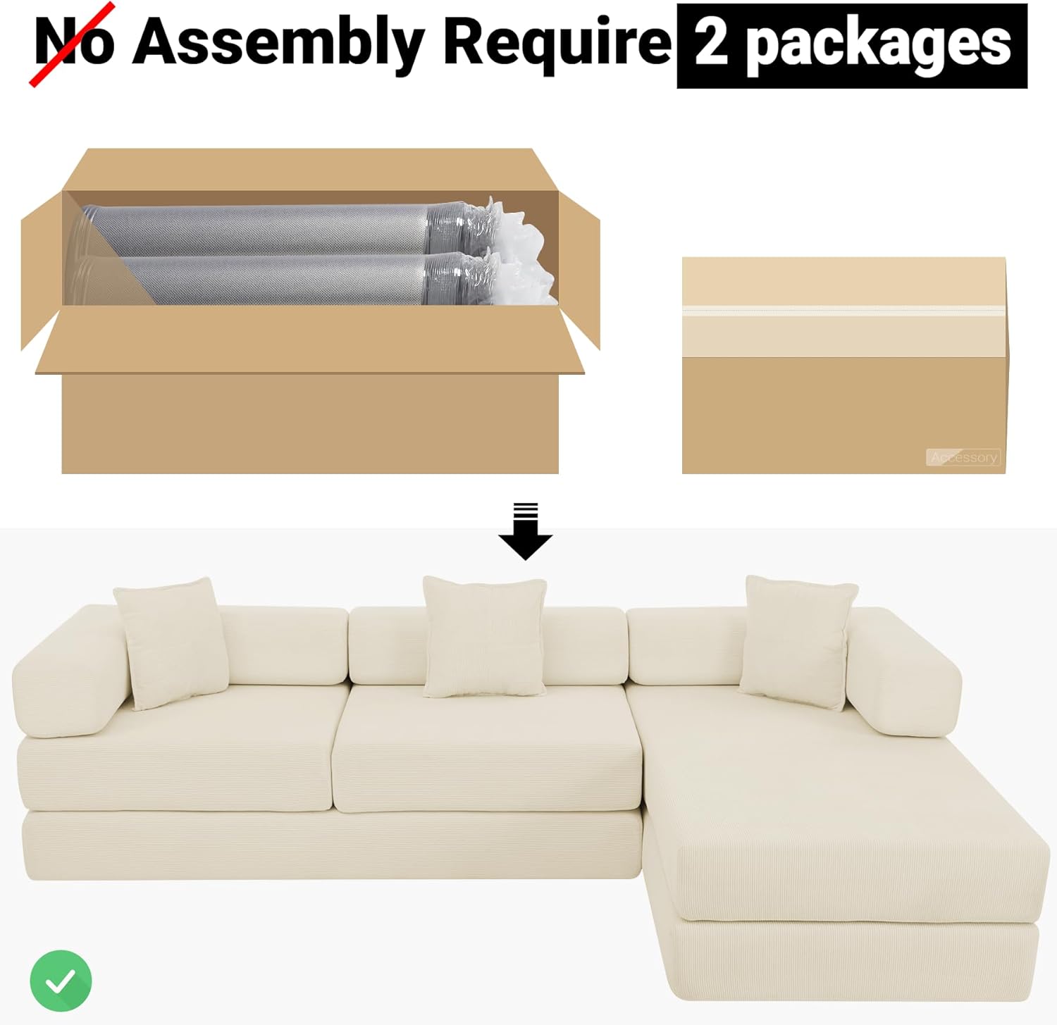 108" Oversized Convertible Sleeper Sofa Bed, Corduroy L Shape Sectional Couch, Folding Sofa Bed with Side Pocket, Modern Cloud Floor Mattress Couch, Modular Sofa for Living Room, Beige