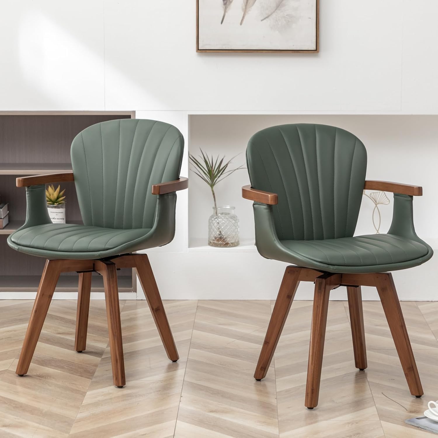 LUNLING Swivel Dining Chairs, Mid Century Modern Green Faux Leather Kitchen Chairs with Arms,Bamboo Legs Side Chairs No Wheels,Accent Chair for Dining Rooms and Offices,1PCS